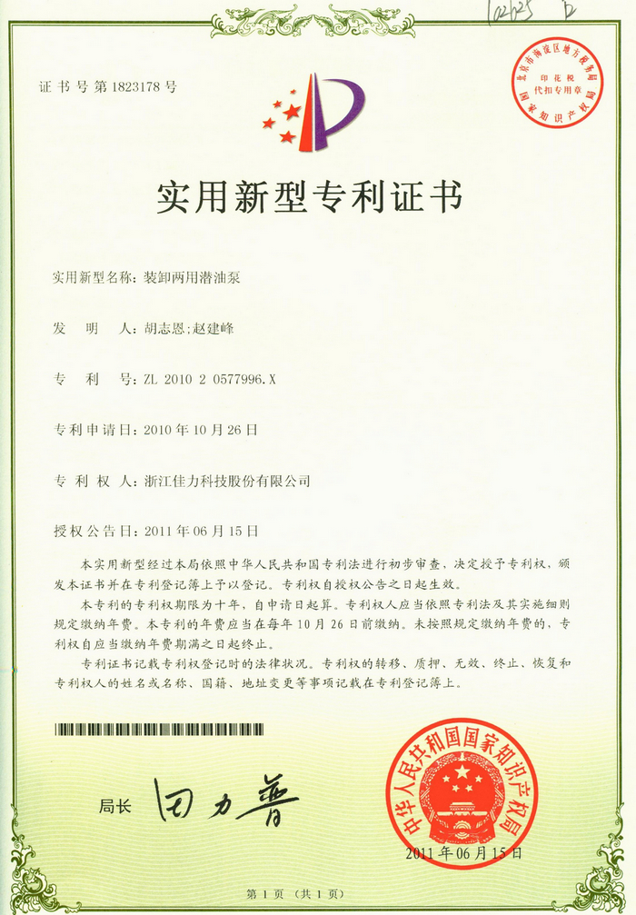 熱烈祝賀佳力科技股份有限公司再獲2項國家專利。他們是“裝卸兩用潛油泵”(專利號:ZL201020577996.X)和“化工流程智能泵“(專利號:ZL201020576780.1)。獲得國家新型實用專利,由國家知識產權局頒發證書。