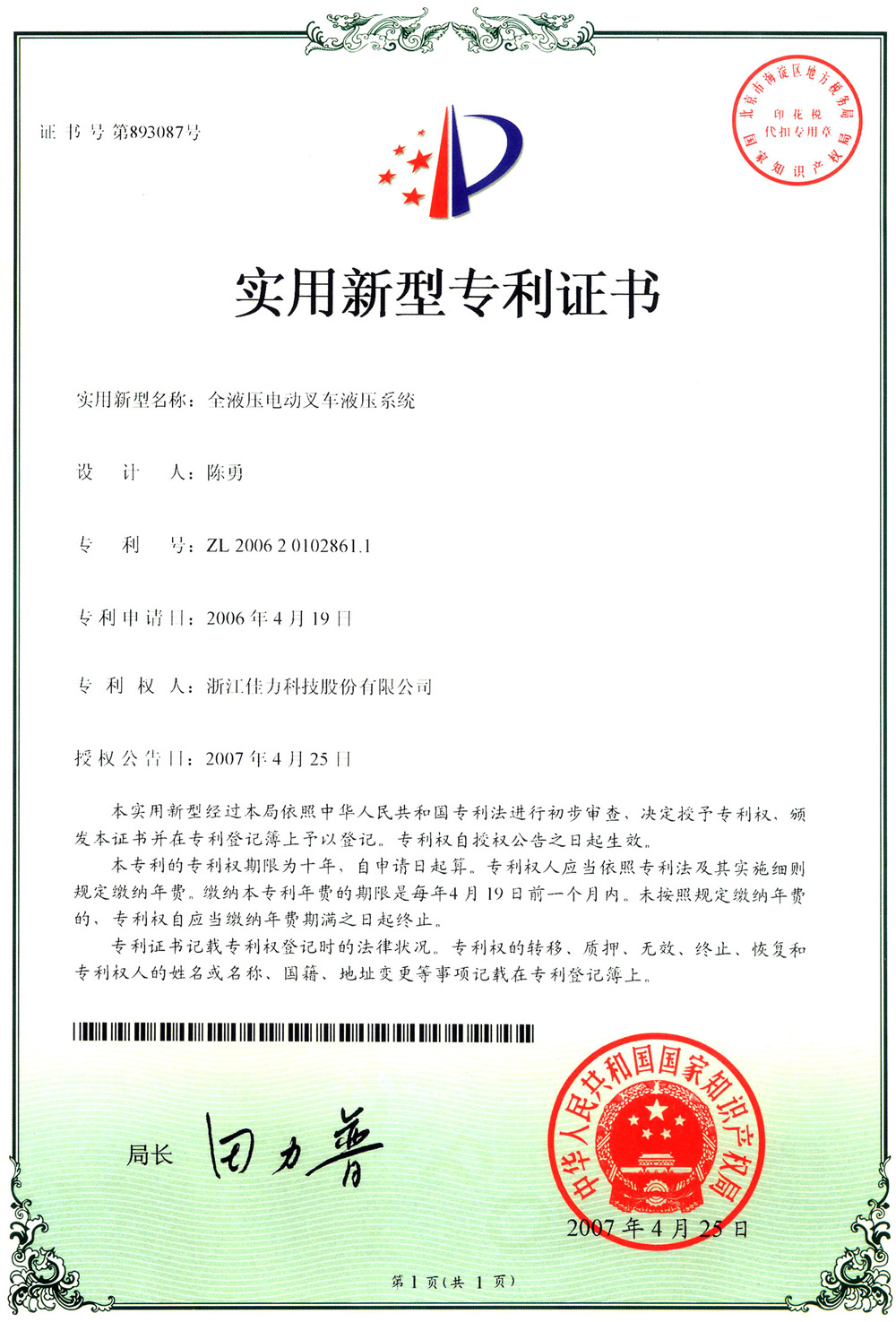 實(shí)用新型專利證書(shū)