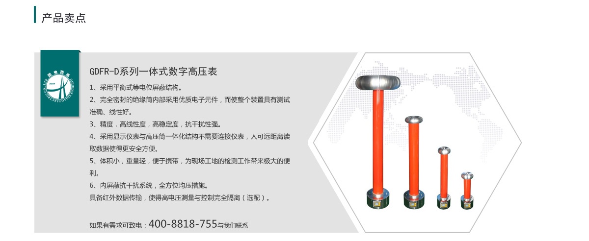 GDFR-D型系列高壓數(shù)字表(分壓器)采用阻容式分壓器和高阻數(shù)字表一體化設計,實現(xiàn)高壓測量與顯示,客戶可根據(jù)所測量電壓精度要求,來選擇不同的準確度。該系列最高準確度分別為:AC:0.5% DC:0.5%,若需更高準確度,可選擇我公司的高精度、高穩(wěn)定度的交流校驗標準和直流校驗標準;采用電位屏蔽式高壓測量裝置,是我公司最新研發(fā)的產(chǎn)品,與其他公司同類產(chǎn)品相比,國電西高采用美國進口的填充介質,內部采用多種專利屏蔽技術,使該系列產(chǎn)品有更長的使用壽命和更高的穩(wěn)定性,在該領域擁有絕大部分的市場占用量和市場美譽度。