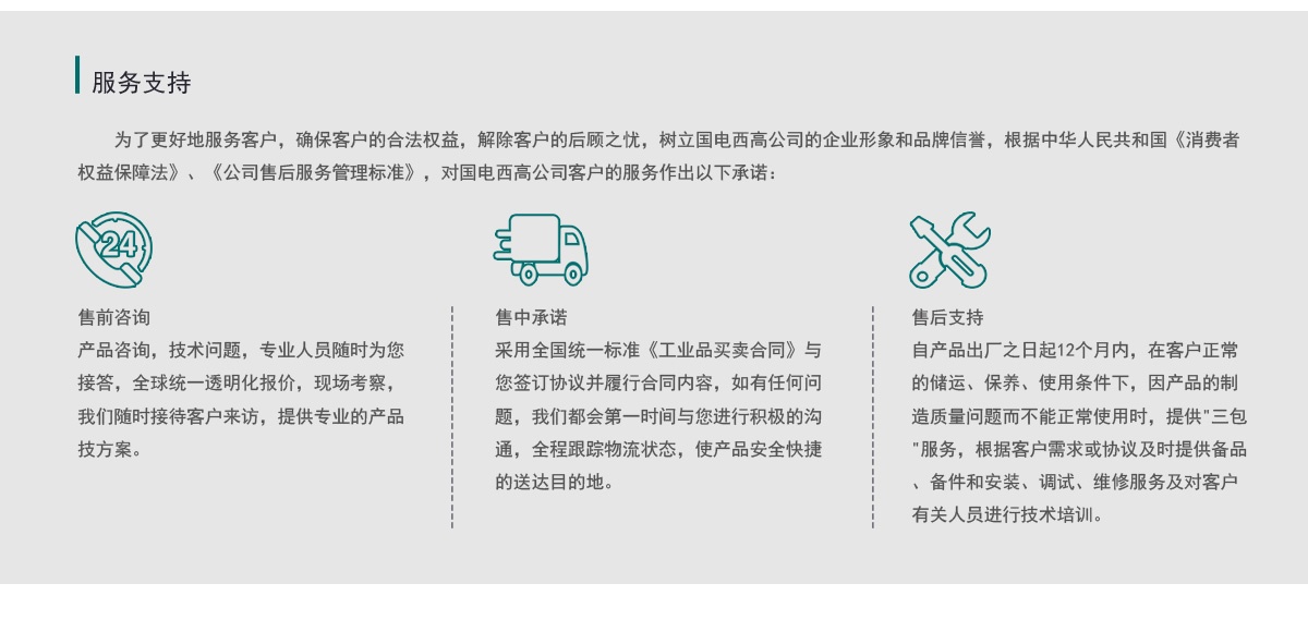 自產(chǎn)品出廠之日起12個月內,在客戶正常 的儲運、保養(yǎng)、使用條件下,因產(chǎn)品的制 造質量問題而不能正常使用時,提供"三包 "服務,根據(jù)客戶需求或協(xié)議及時提供備品 、備件和安裝、調試、維修服務及對客戶 有關人員進行技術培訓。