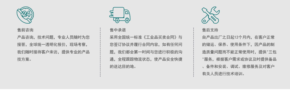 自產品出廠之日起12個月內,在客戶正常 的儲運、保養、使用條件下,因產品的制 造質量問題而不能正常使用時,提供"三包 "服務,根據客戶需求或協議及時提供備品 、備件和安裝、調試、維修服務及對客戶 有關人員進行技術培訓。