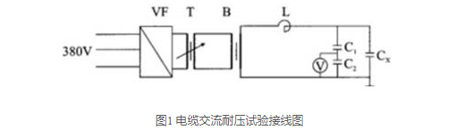 其中:VF表示變頻電源,T表示調(diào)壓器,B表示中間變壓器,L表示高壓電抗器,C1、C2表示分壓器電容,Cx表示試驗(yàn)電纜,V表示電壓表。