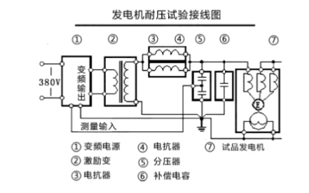 串聯諧振試驗方法并不難,它由變頻電源輸入電壓,再調節頻率,調節輸出容量,最后將電壓輸入到變壓器的端頭,有關串聯諧振的具體接線和測試方法我們已經講過多次,下面看看接線的原理圖: