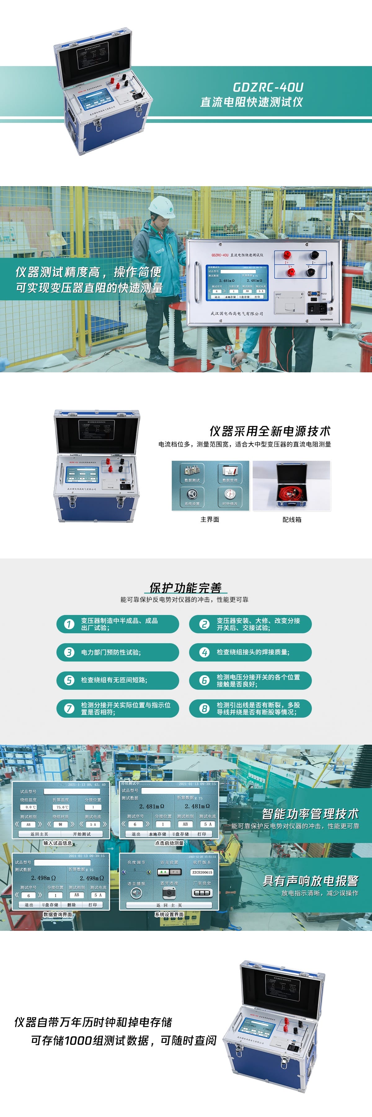 變壓器直流電阻是變壓器制造中半成品、成品出廠試驗、安裝、大修、改變分接開關后、交接試驗及電力部門預防性試驗的必測項目。可以檢查繞組接頭的焊接質量和繞組有無匝間短路,可以檢測電壓分接開關的各個位置接觸是否良好以及分接開關實際位置與指示位置是否相符,引出線是否有斷裂,多股導線并繞是否有斷股等情況。為了滿足變壓器直流電阻快速測量的需要,我公司研制的GDZRC-40U直流電阻測試儀。該儀器采用全新電源技術,具有體積小、重量輕、輸出電流大、重復性好、抗干擾能力強、保護功能完善等特點。整機由高速單片機控制,自動化程度高,具有自動放電和放電報警功能。儀器測試精度高,操作簡便,可實現(xiàn)變壓器直阻的快速測量。