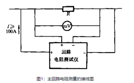 基于直流壓降法時,可采用直流電源、分流器和毫伏表測量回路電阻,也可采用回路電阻測試儀來進行測量。二者基本原理一致,測量時應注意接線方式帶來的誤差,電壓測量線應在電流輸出線的內側,且電壓測量線應接在被測回路正確的位置,否則將產生較大的測量誤差,接線方式如圖1所示。