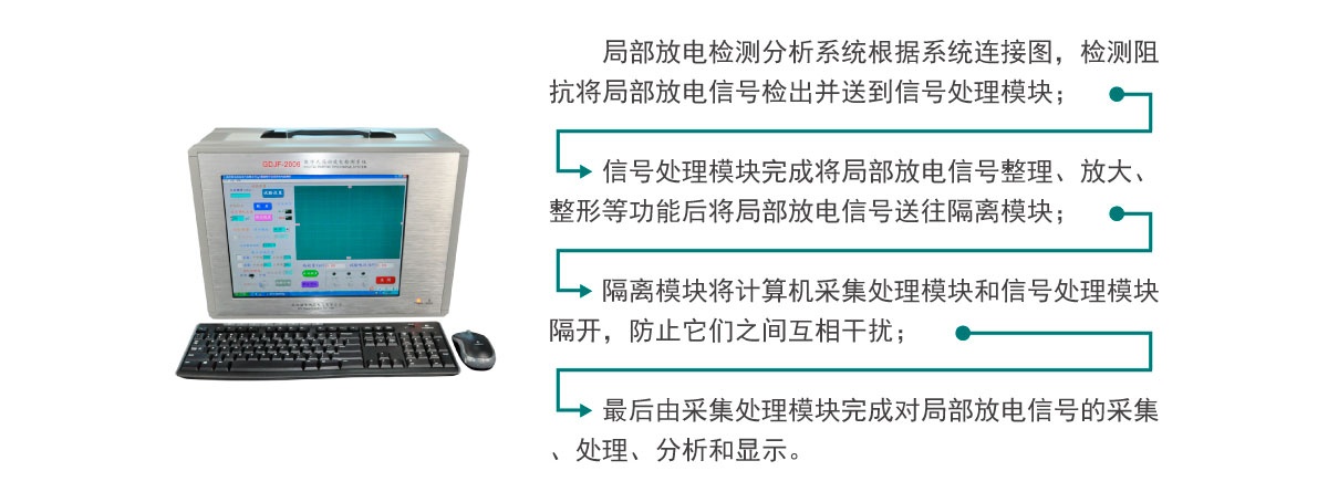 GDJF2006 局部放電檢測分析系統(局放儀)由三大模塊構成:信號處理模塊,隔離模塊,采集處理模塊。根據系統連接圖,檢測阻抗將局部放電信號檢出并送到信號處理模塊,信號處理模塊完成將局部放電信號整理、放大、整形等功能后將局部放電信號送往隔離模塊,隔離模塊將計算機采集處理模塊和信號處理模塊隔開,防止它們之間互相干擾,最后由采集處理模塊完成對局部放電信號的采集.處理.分析和顯示