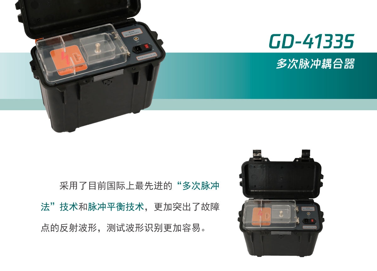 GD-4133S電纜測試多次脈沖耦合器與GD-4133電纜多次脈沖故障測距儀和高壓信號發(fā)生器配合使用,用于檢測各種電力電纜的高阻泄漏故障、閃絡(luò)性故障、低阻接地和斷路故障。GD-4133S為GD-4133電纜多次脈沖故障測距儀提供脈沖信號耦合通路,同時實現(xiàn)了與高壓設(shè)備的電氣隔離。它采用目前國際上最先進的“多次脈沖法”技術(shù),使電纜故障波形的判斷變得簡單方便。