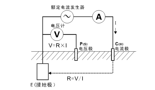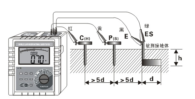 如圖所示:從被測物體起,分別將P(H)、C(H)輔助接地棒呈一條直線深埋入大地,將接地測試線(黑、綠、黃、紅)從儀表的E、ES、P(S)、C(H)接口對應連接到被測接地極E、輔助電壓極P(S)、輔助電流極C(H)上。